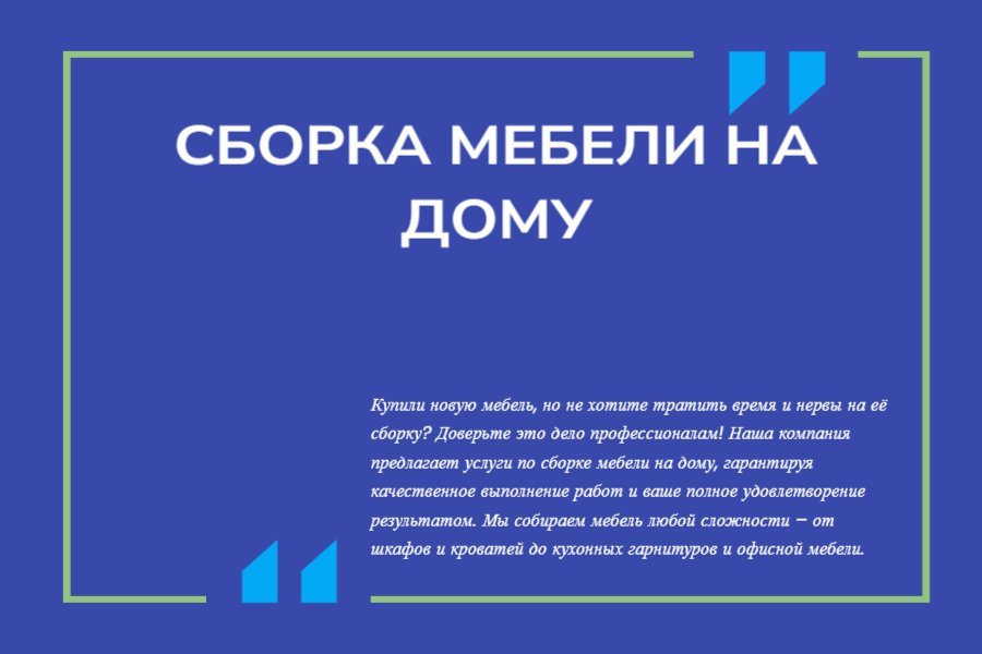 - Опыт и квалификация. Наши мастера обладают многолетним опытом работы с мебелью от различных производителей. Мы знаем все нюансы сборки мебели, что позволяет нам гарантировать её надежность и долговечность. Ваша мебель будет собрана быстро, аккуратно и в точном соответствии с инструкцией.